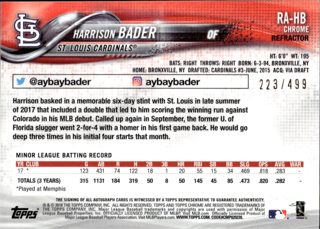 2018 Harrison Bader Topps Chrome REFRACTOR AUTOGRAPH ROOKIE 223/499 AUTO RC #RA-HB St. Louis Cardinals