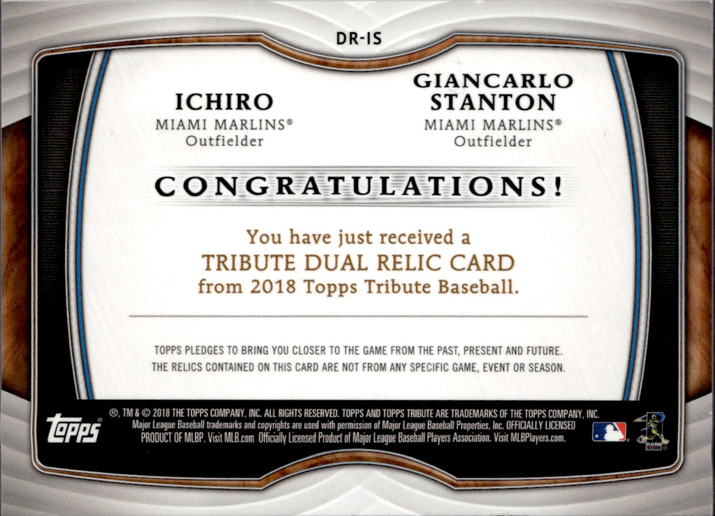 2018 Ichiro Suzuki Giancarlo Stanton Topps Tribute DUAL JERSEY 141/150 RELIC #DR-15 Miami Marlins