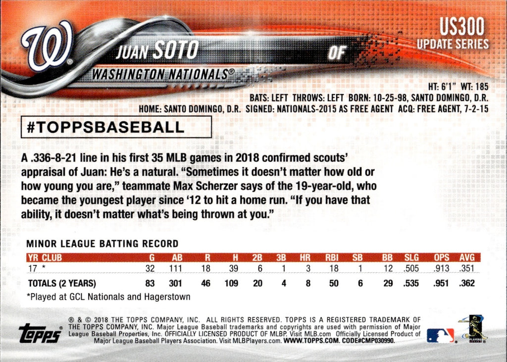 2018 Juan Soto Topps Update ROOKIE RC #US300 Washington Nationals 1