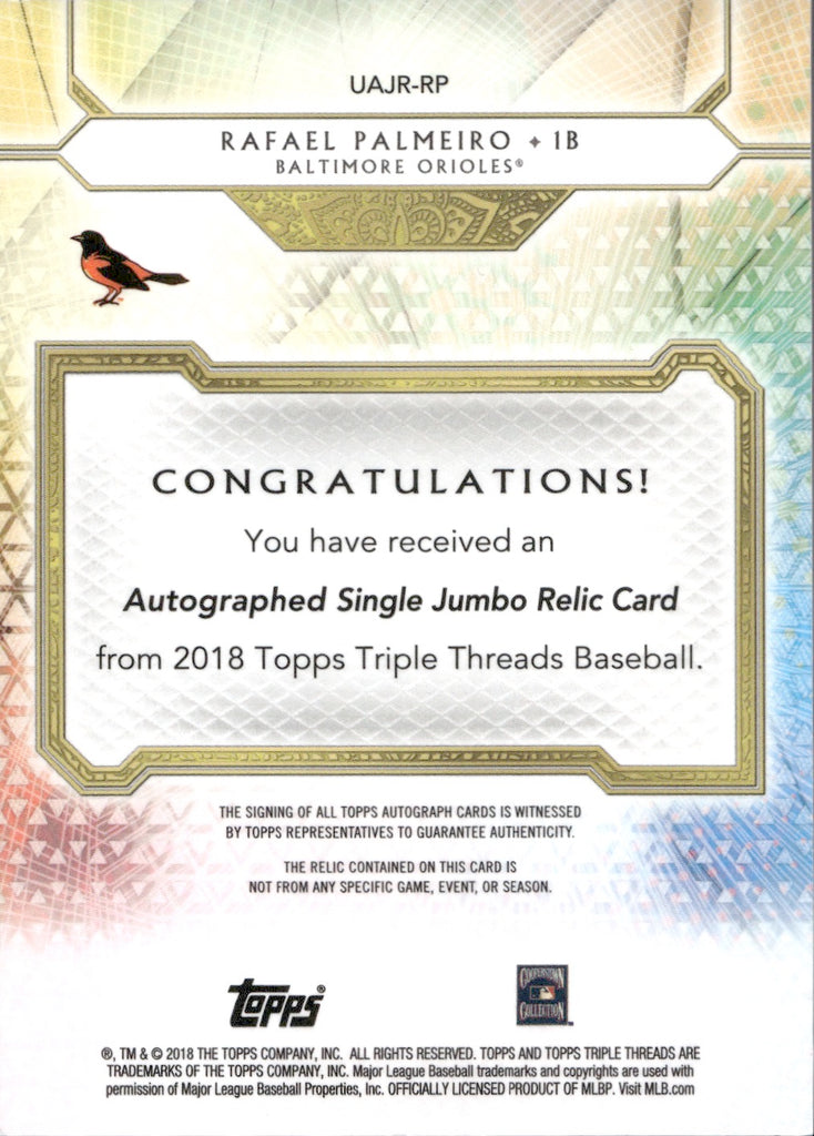 2018 Rafael Palmeiro Topps Triple Threads AUTOGRAPH JUMBO RELIC GAME-USED JERSEY 18/75 AUTO #UAJR-RP Baltimore Orioles