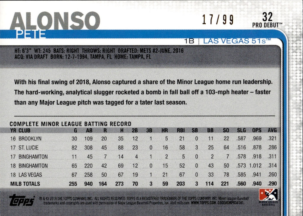 2019 Pete Alonso Topps Pro Debut GREEN ROOKIE 17/99 RC #32 New York Mets