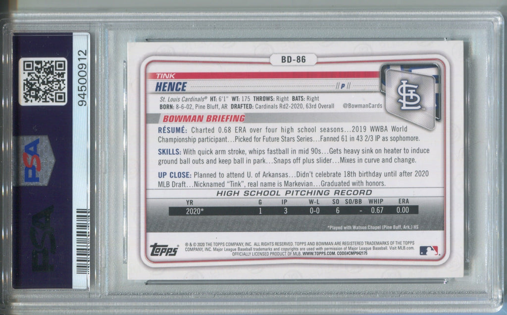 2020 Tink Hence Bowman Draft 1ST BOWMAN PSA 10 #BD86 St. Louis Cardinals 0912