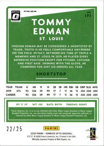 2020 Tommy Edman Donruss Optic BLACK 22/25 #191 St. Louis Cardinals