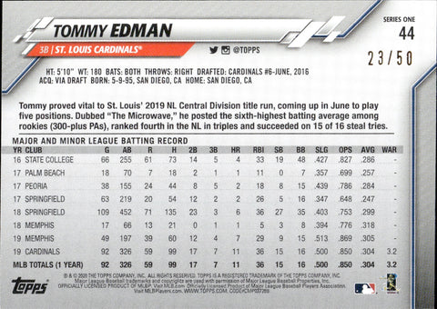 2020 Tommy Edman Topps SERIES ONE FUTURE STARS FATHER'S DAY BLUE 23/50 #44 St. Louis Cardinals