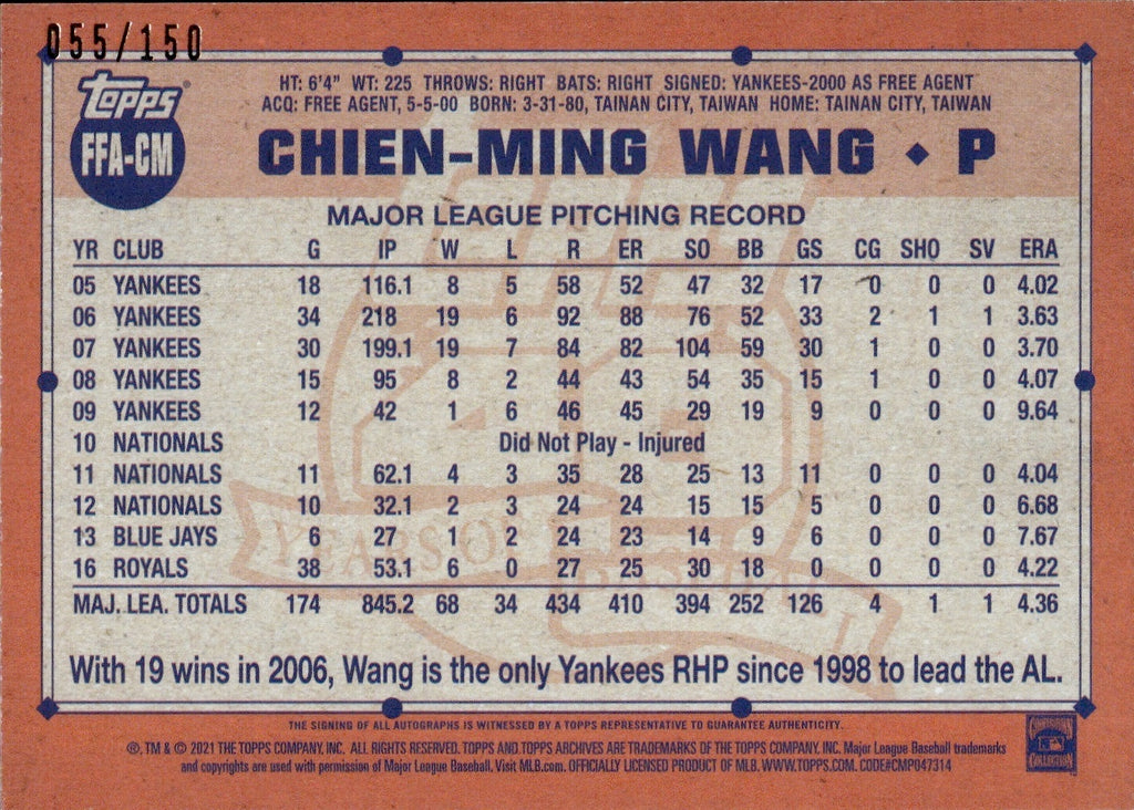 2021 Chien-Ming Wang Topps Archives FAN FAVORITES 1991 DESIGN PURPLE AUTO 055/150 AUTOGRAPH #FFA-CM New York Yankees