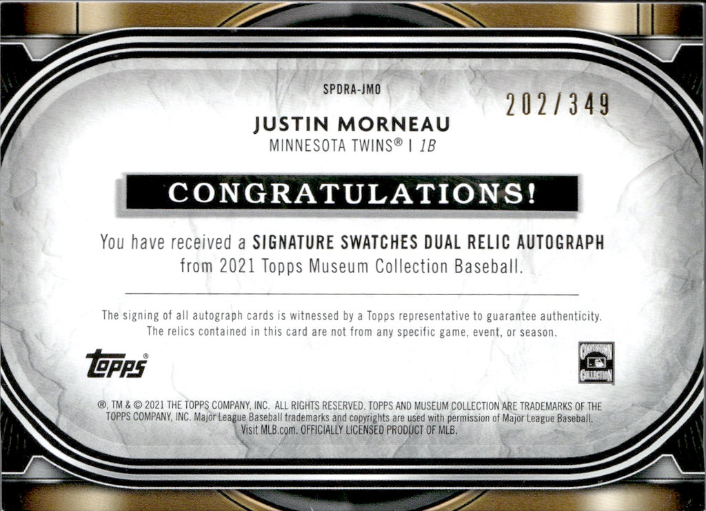 2021 Justin Morneau Topps Museum Collection SIGNATURE SWATCHES DUAL RELIC AUTOGRAPH BAT 202/349 AUTO #SPDRA-JMO Minnesota Twins