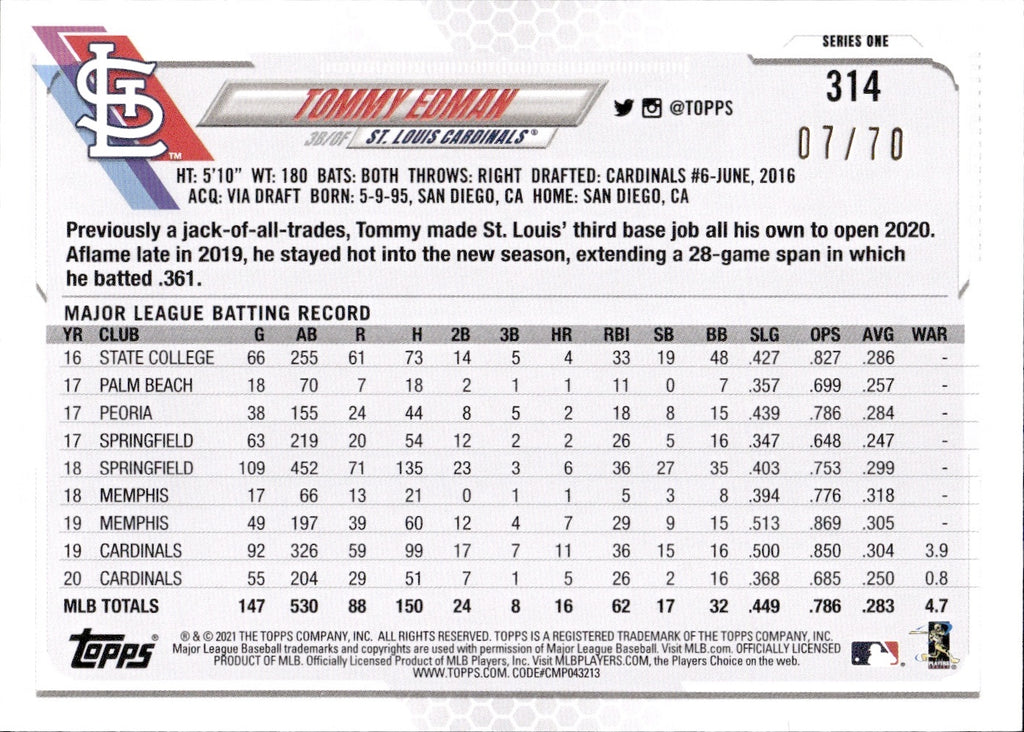 2021 Tommy Edman Topps Series 1 BLACK BORDER 07/70 #314 St. Louis Cardinals