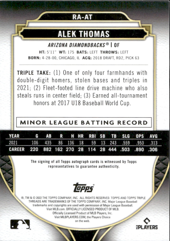 2022 Alek Thomas Topps Triple Threads AUTOGRAPH ROOKIE 11/75 AUTO RC #RA-AT Arizona Diamondbacks