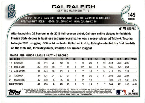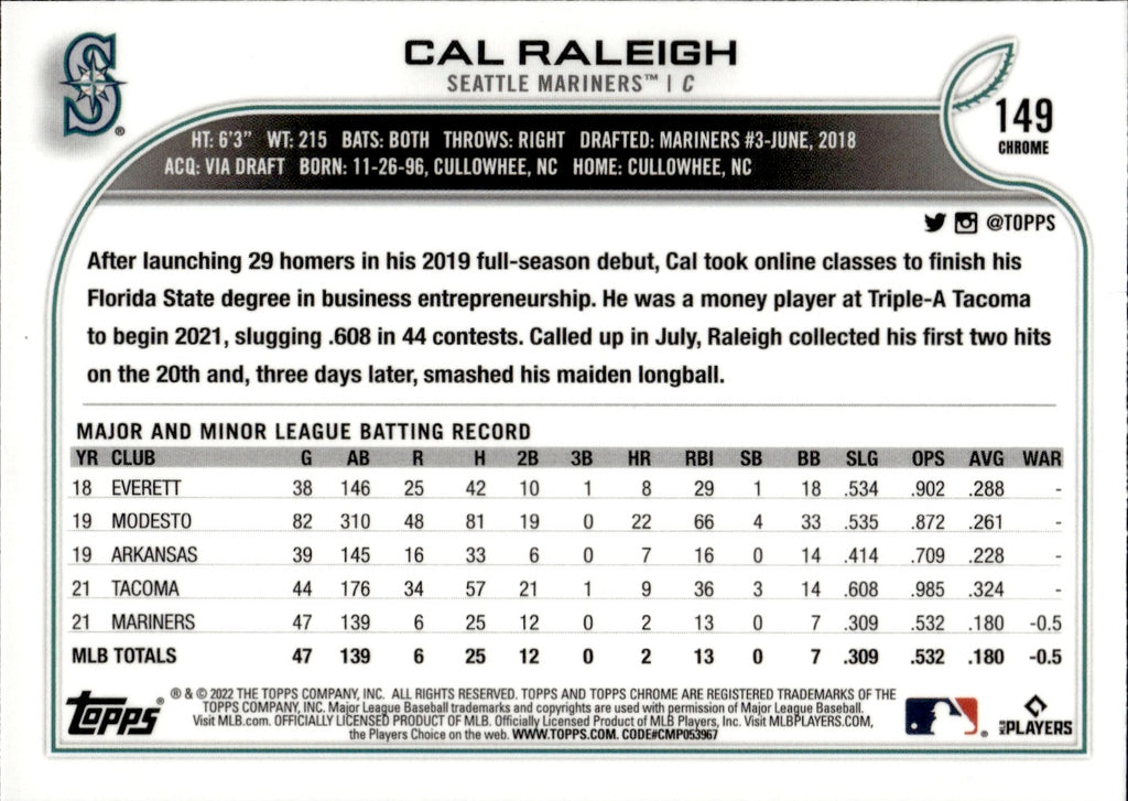 2022 Cal Raleigh Topps Chrome PRISM REFRACTOR ROOKIE RC #149 Seattle Mariners 2