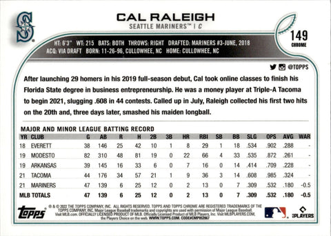 2022 Cal Raleigh Topps Chrome ROOKIE RC #149 Seattle Mariners 4