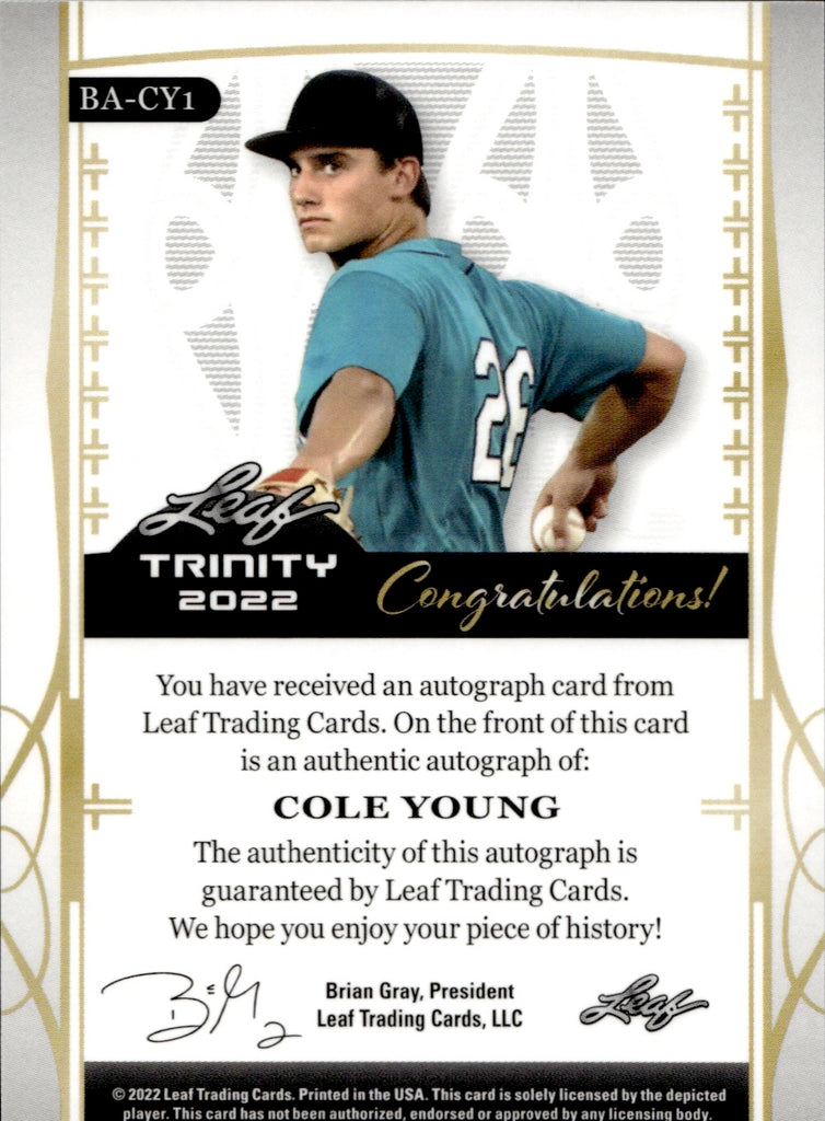 2022 Cole Young Leaf Trinity ROOKIE AUTO 06/50 AUTOGRAPH RC #BA-CY1 Seattle Mariners