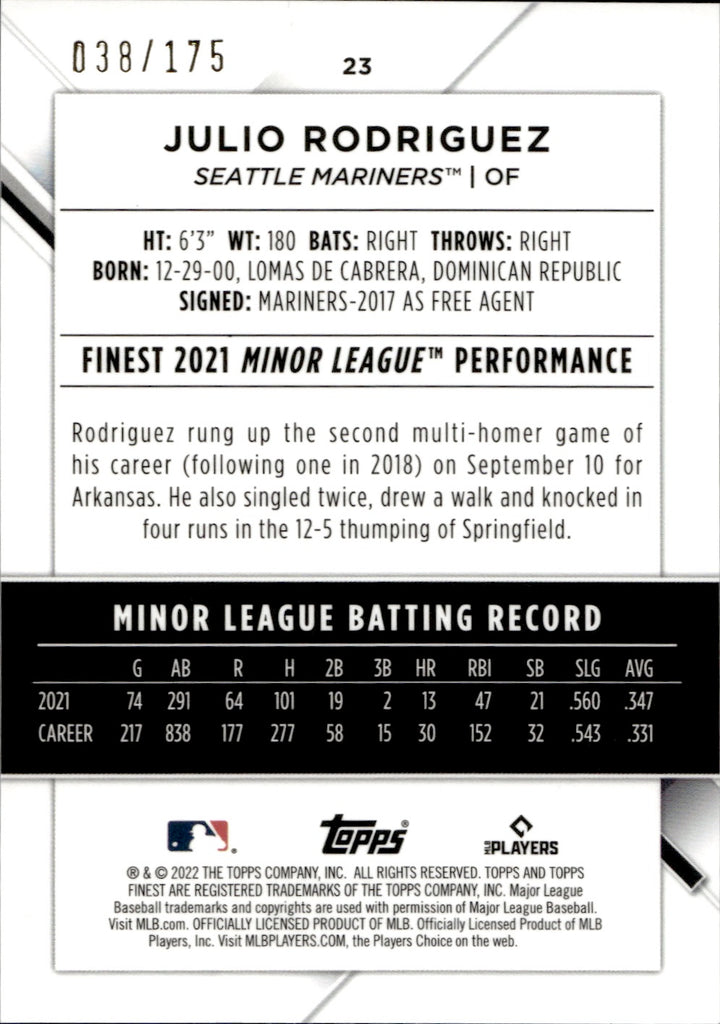 2022 Julio Rodriguez Topps Finest AQUA SHIMMER ROOKIE 038/175 RC #23 Seattle Mariners