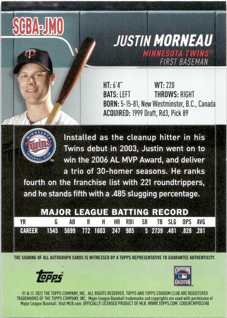 2022 Justin Morneau Topps Stadium Club AUTOGRAPH AUTO #SCBA-JMO Minnesota Twins