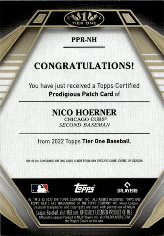 2022 Nico Hoerner Topps Tier One JUMBO GAME USED PRODIGIOUS PATCH 10/10 RELIC #PPR-NH Chicago Cubs