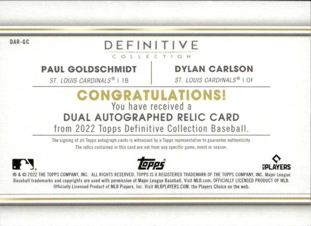 2022 Paul Goldschmidt Dylan Carlson Topps Definitive Collection DUAL AUTOGRAPH RELIC AUTO JERSEY 27/35 #DAR-GC St. Louis Cardinals