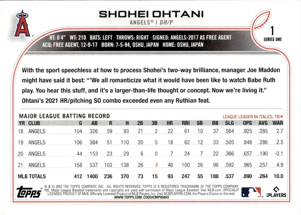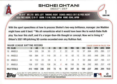 2022 Shohei Ohtani Topps Series 1 GOLD FOIL #1 Anaheim Angels 2