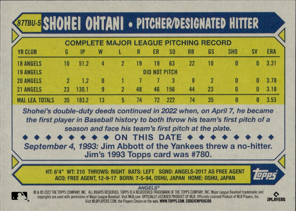 2022 Shohei Ohtani Topps Update Series BLUE 1987 DESIGN #87TBU-5 Anaheim Angels