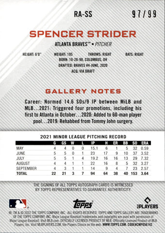 2022 Spencer Strider Topps Gallery GREEN BORDER ROOKIE AUTO 97/99 AUTOGRAPH RC #RA-SS Atlanta Braves