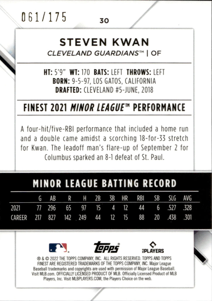 2022 Steven Kwan Topps Finest AQUA SHIMMER REFRACTOR ROOKIE 061/175 RC #30 Cleveland Guardians