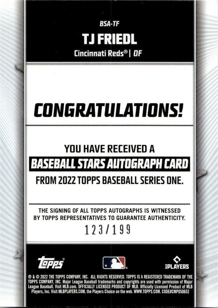 2022 TJ Friedl Topps Series 1 BLACK ROOKIE BASEBALL STARS AUTO 123/199 AUTOGRAPH #BSA-TF Cincinnati Reds