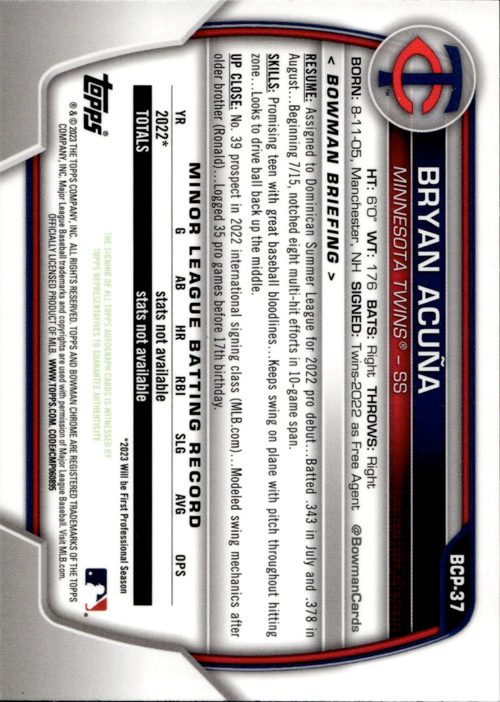 2023 Bryan Acuna Topps Bowman Chrome MEGA BOX IMAGE VARIATION PROSPECT Minnesota Twins #BCP-37