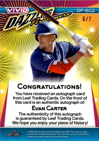 2023 Evan Carter Leaf Vivid DAZZLING PERFORMERS AUTO 6/7 AUTOGRAPH #DP-EC2 Texas Rangers