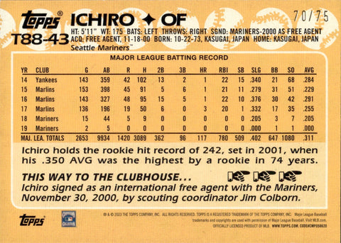 2023 Ichiro Suzuki Topps GOLD 1988 DESIGN 70/75 #T88-43 Seattle Mariners