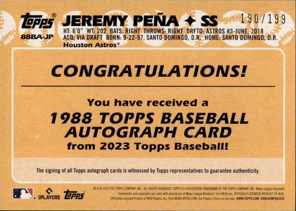 2023 Jeremy Pena Topps 1988 DESIGN BLACK BORDER AUTOGRAPH 190/199 AUTO #88BA-JP Houston Astros