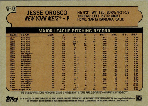 2023 Jesse Orosco Topps Achives FAN FAVORITES AUTO AUTOGRAPH #72FF-JOR New York Mets