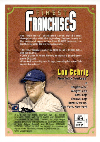 2023 Lou Gehrig Topps Finest Flashbacks RARE GOLD 1996 FINEST FRANCHISES SP #194 New York Yankees HOF