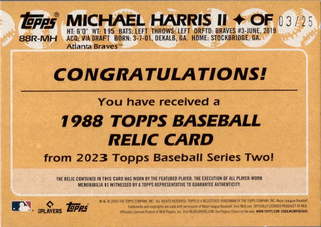 2023 Michael Harris II Topps SERIES 2 ROOKIE 1988 DESIGN RELIC PATCH RED RC 3/25 #88R-MH Atlanta Braves