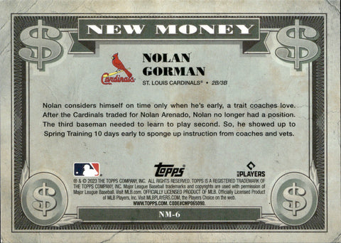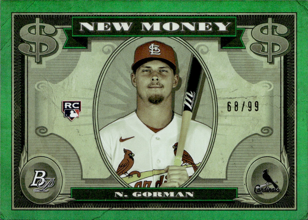 2023 Nolan Gorman Bowman Platinum NEW MONEY GREEN ROOKIE 68/99 RC #NM-6 St. Louis Cardinals