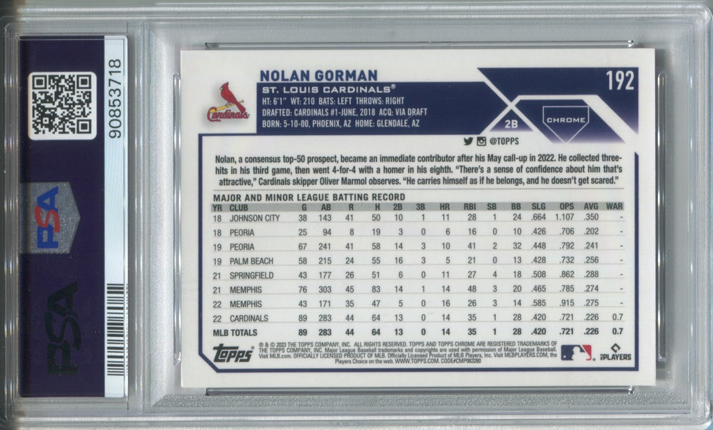 2023 Nolan Gorman Topps Chrome Logofractor ROOKIE PINK REFRACTOR 038/199 RC PSA 10 #192 St. Louis Cardinals 3718