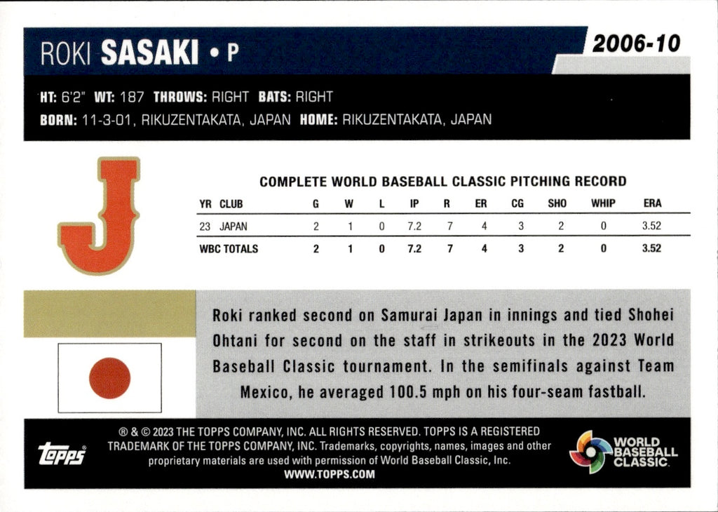 2023 Roki Sasaki Topps Eorld Baseball Classic ROOKIE RC #2006-10 Los Angeles Dodgers