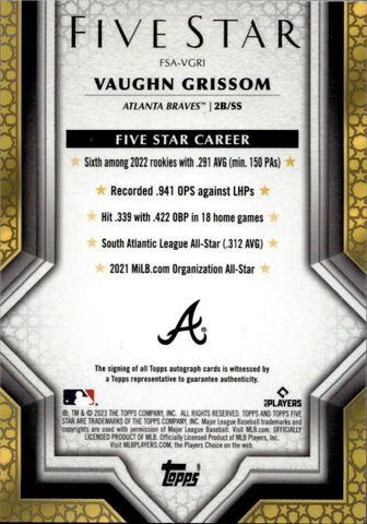 2023 Vaughn Grissom Topps Five Star ROOKIE AUTOGRAPH RC #FSA-VGRI Atlanta Braves