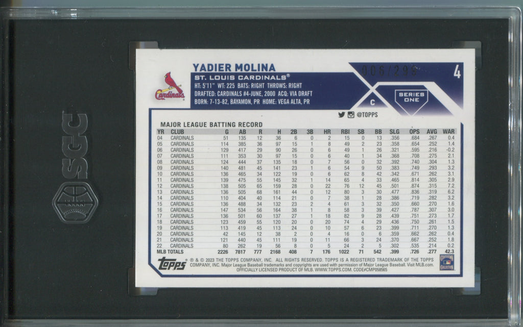 2023 Yadier Molina Topps Series 1 ORANGE FOILBOARD 006/299 SGC 10 #4 St. Louis Cardinals 8041
