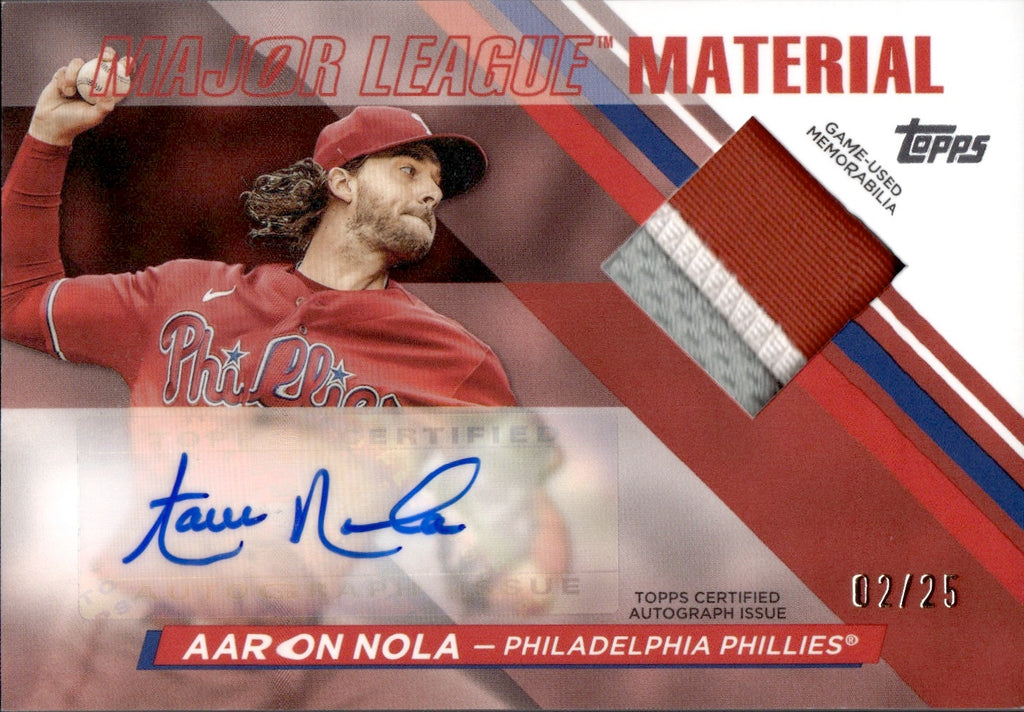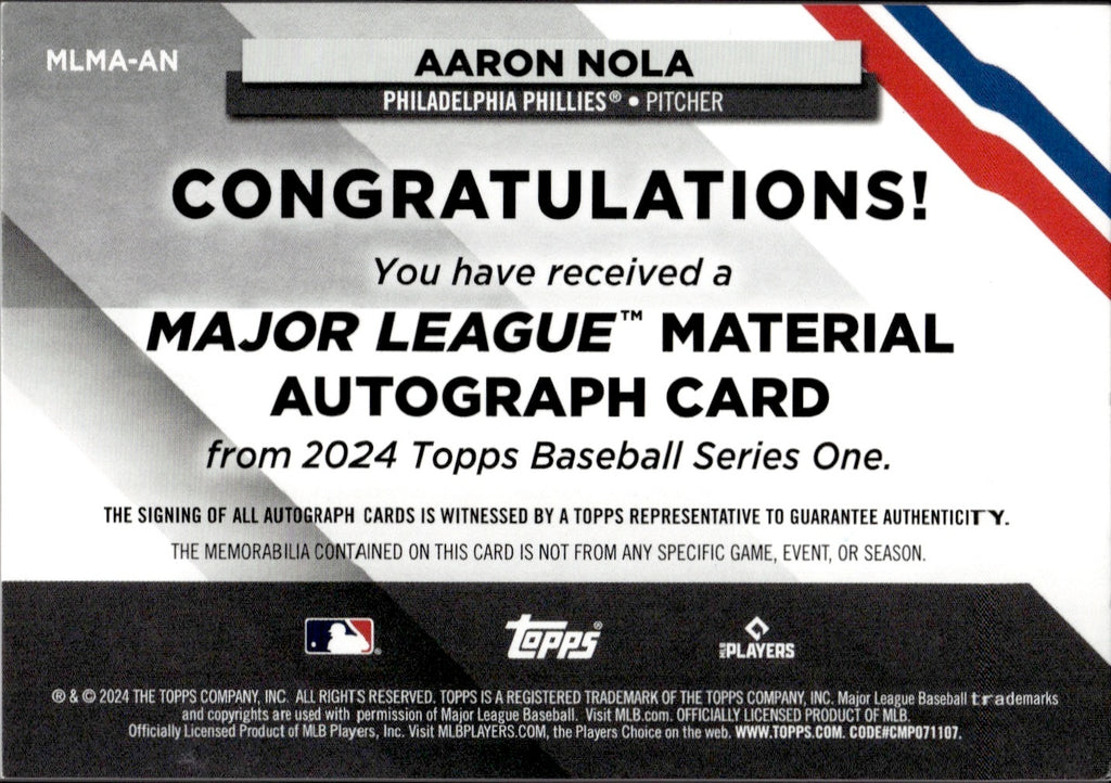 2024 Aaron Nola Topps Series 1 MAJOR LEAGUE MATERIAL PATCH AUTO 02/25 AUTOGRAPH RELIC #MLMA-AN Philadelphia Phillies