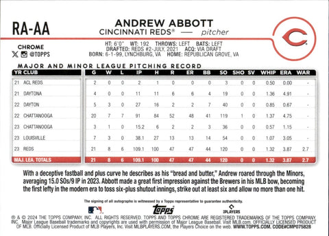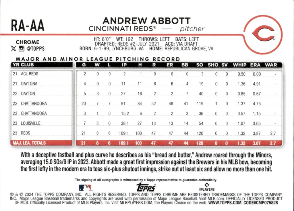 2024 Andrew Abbott Topps Chrome ROOKIE AUTO AUTOGRAPH #RA-AA Cincinnati Reds