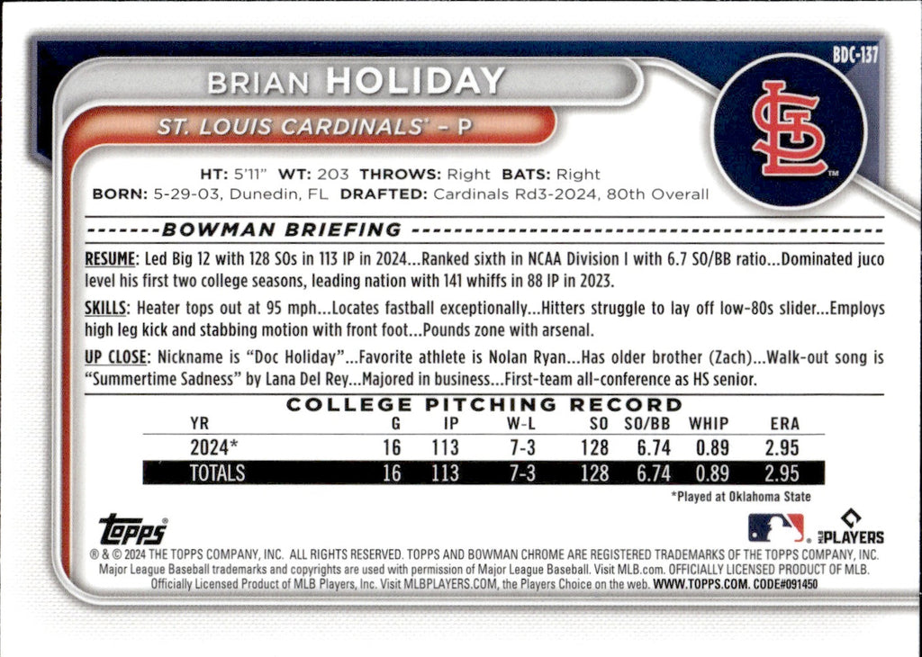 2024 Brian Holiday Bowman Chrome Draft 1ST BOWMAN GOLD REFRACTOR 49/50 #BDC-137 St. Louis Cardinals
