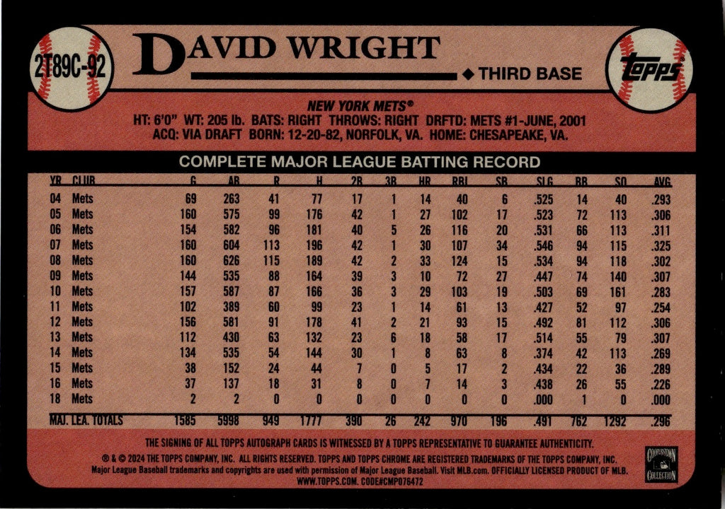 2024 David Wright Topps Series 2 SILVER PACK GOLD REFRACTOR 1989 DESIGN AUTO 40/50 AUTOGRAPH #2T89C-92 New York Mets