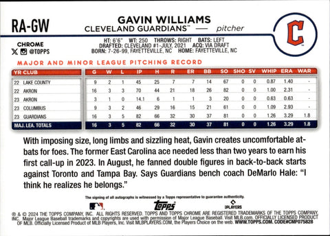 2024 Gavin Williams Topps Chrome ROOKIE AQUA WAVE REFRACTOR AUTO 152/199 AUTOGRAPH RC #RA-GW Cleveland Guardians