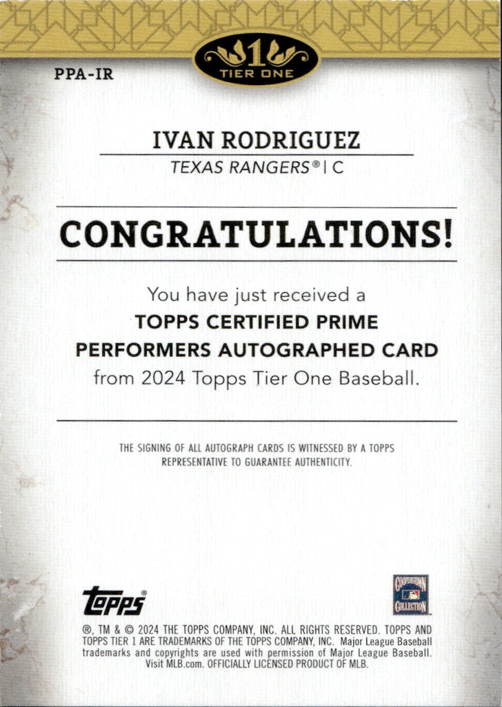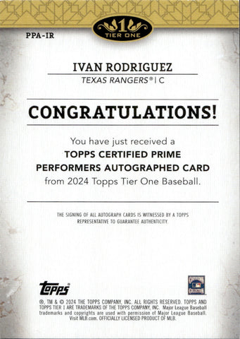 2024 Ivan Rodriguez Topps Tier One PRIME PERFORMERS HOLO SILVER INK AUTOGRAPH AUTO 4/10 #PPA-IR Texas Rangers