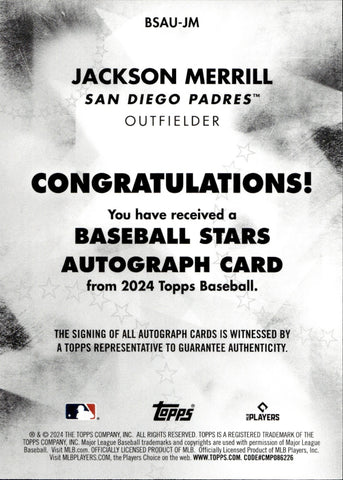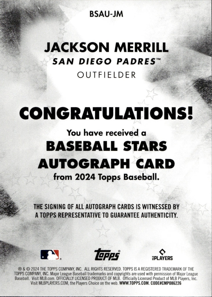 2024 Jackson Merrill Topps BASEBALL STARS ROOKIE AUTO AUTOGRAPH RC #BSAU-JM San Diego Padres