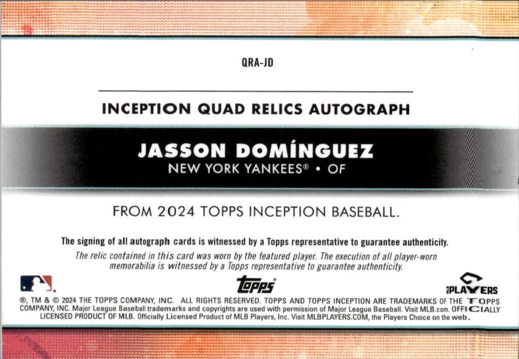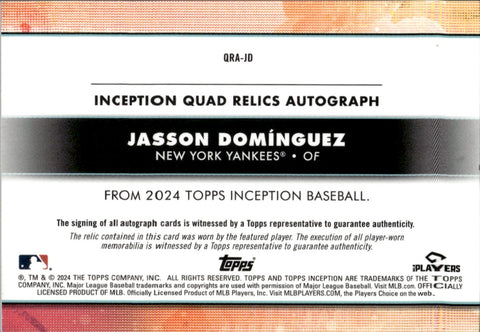 2024 Jasson Dominguez Topps Inception ROOKIE QUAD GLOVE JERSEY AUTO 05/25 AUTOGRAPH RELIC RC #QRA-JD New York Yankees