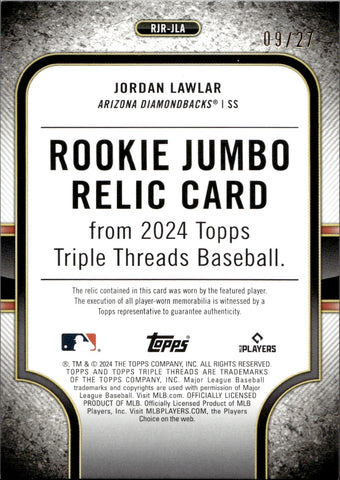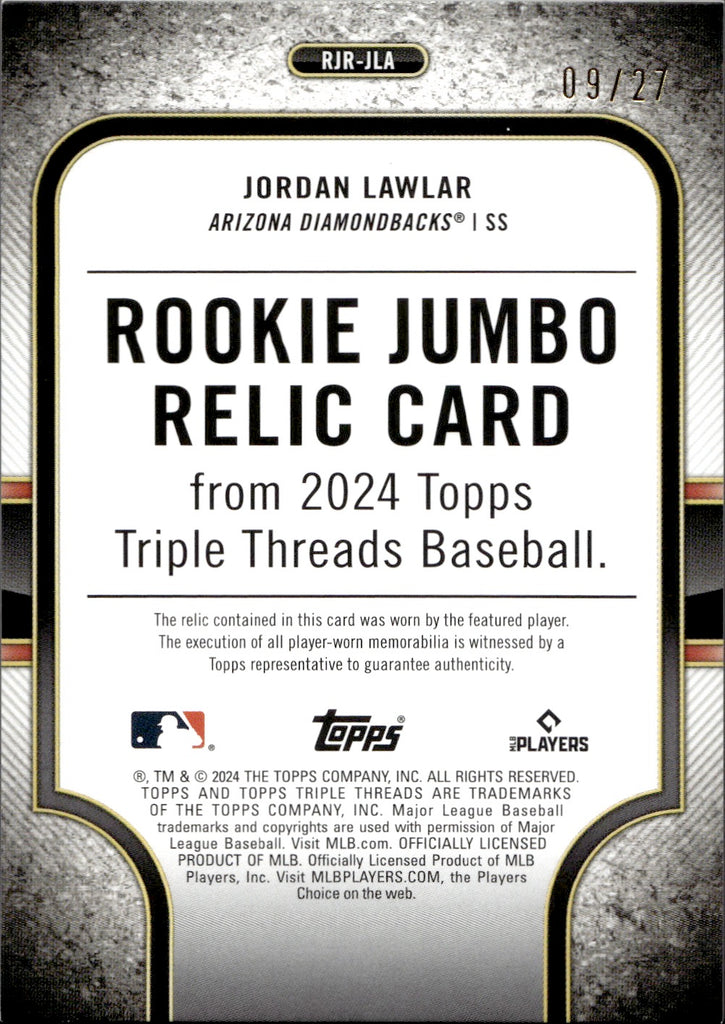 2024 Jordan Lawlar Topps Triple Threads ROOKIE EMERALD GREEN JERSEY 09/27 RELIC #RJR-JLA Arizona Diamondbacks