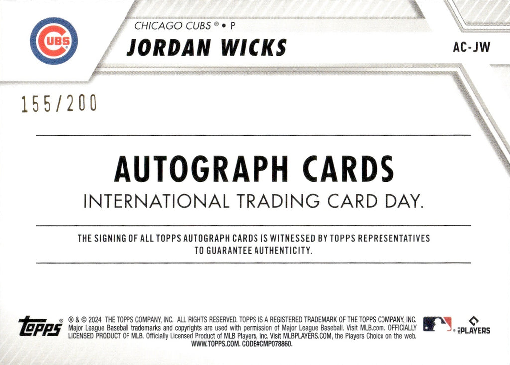 2024 Jordan Wicks Topps International Trading Card Day ROOKIE AUTO 155/200 AUTOGRAPH RC #AC-JW Chicago Cubs