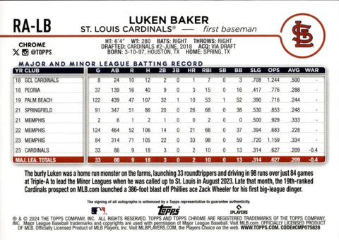 2024 Luken Baker Topps Chrome ROOKIE AUTO AUTOGRAPH RC #RA-LB St. Louis Cardinals 3