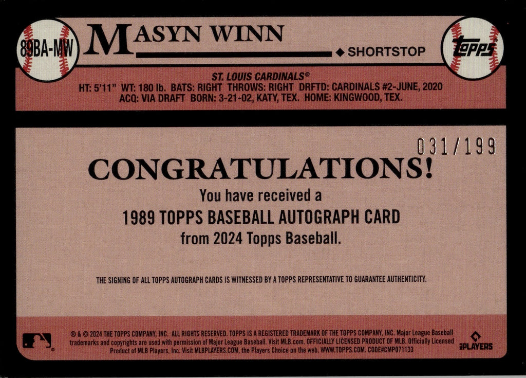 2024 Masyn Winn Topps 1989 DESIGN BLACK BORDER ROOKIE AUTO 031/199 AUTOGRAPH RC #89BA-MW St. Louis Cardinals