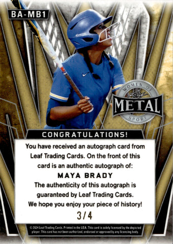 2024 Maya Brady Leaf Women of Sport Metal ORANGE AUTO 3/4 AUTOGRAPH #BA-MB1 UCLA Bruins