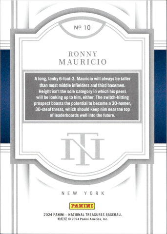 2024 Ronny Mauricio Panini National Treasures ROOKIE JERSEY NUMBER 10/99 RC #10 New York Mets